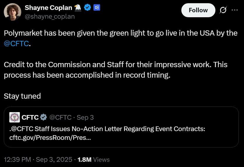 In September, the CFTC issued a no-action letter to QCX, granting relief from certain federal reporting and recordkeeping requirements for event contracts. Polymarket CEO Shayne Coplan said the decision effectively gives the platform “the green light to go live in the USA.”