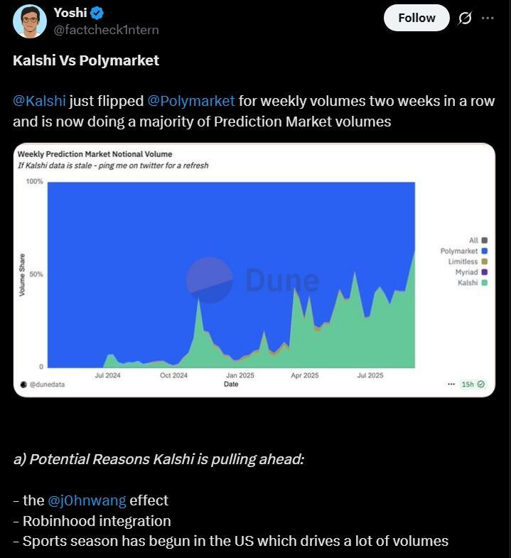 Market watchers say momentum is shifting, fueled by the start of the National Football League season. Market analyst Tarek Mansour noted this week that Kalshi processed $441 million in volume since kickoff, writing: “NFL Week 1 is equal to a US election.”