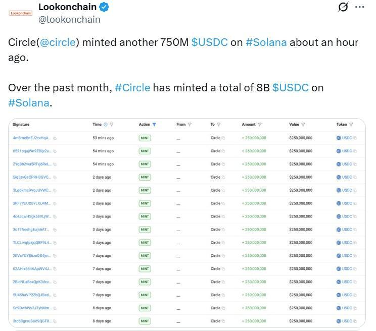 During the past month, Circle minted $8 billion worth of USDC on the Solana network alone, with $750 million minted on Thursday, according to blockchain data platform Lookonchain’s X post.