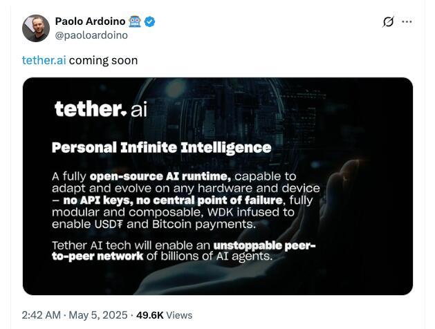 Tether CEO Paolo Adroino took to X on May 5 to tease the imminent launch of Tether AI, the company’s new AI platform designed to offer “personal infinite intelligence.”