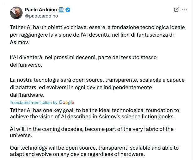 “AI will, in the coming decades, become part of the very fabric of the universe,” Ardoino said in another X post, written in Italian.
