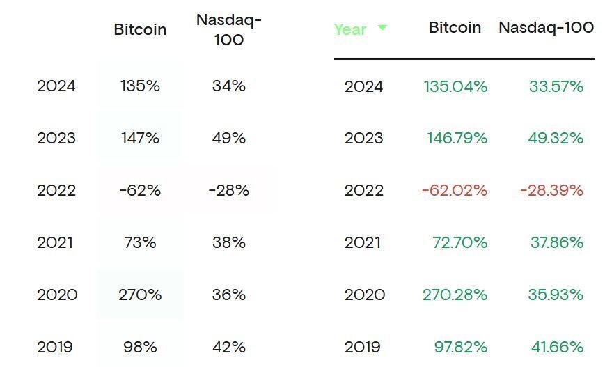 Bitcoin has outperformed the Nasdaq in annual returns for five out of the last six years. Source: Curvo