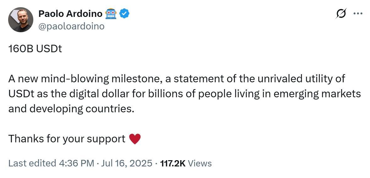 USDt’s market cap hits $160 billion. Source: Paolo Ardoino