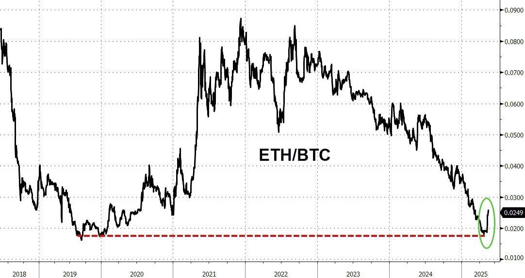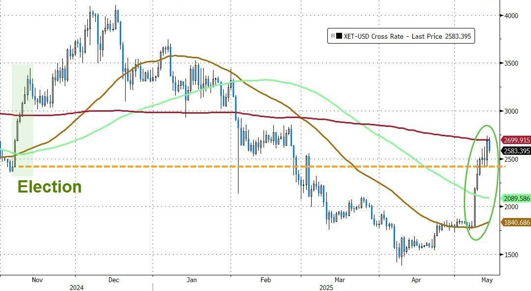 And yet, since the crypto market's April lows, ETH has surged nearly 100% - gaining 65% in the last 30 days alone to tap $2,750, back above pre-election levels (and key technical levels).