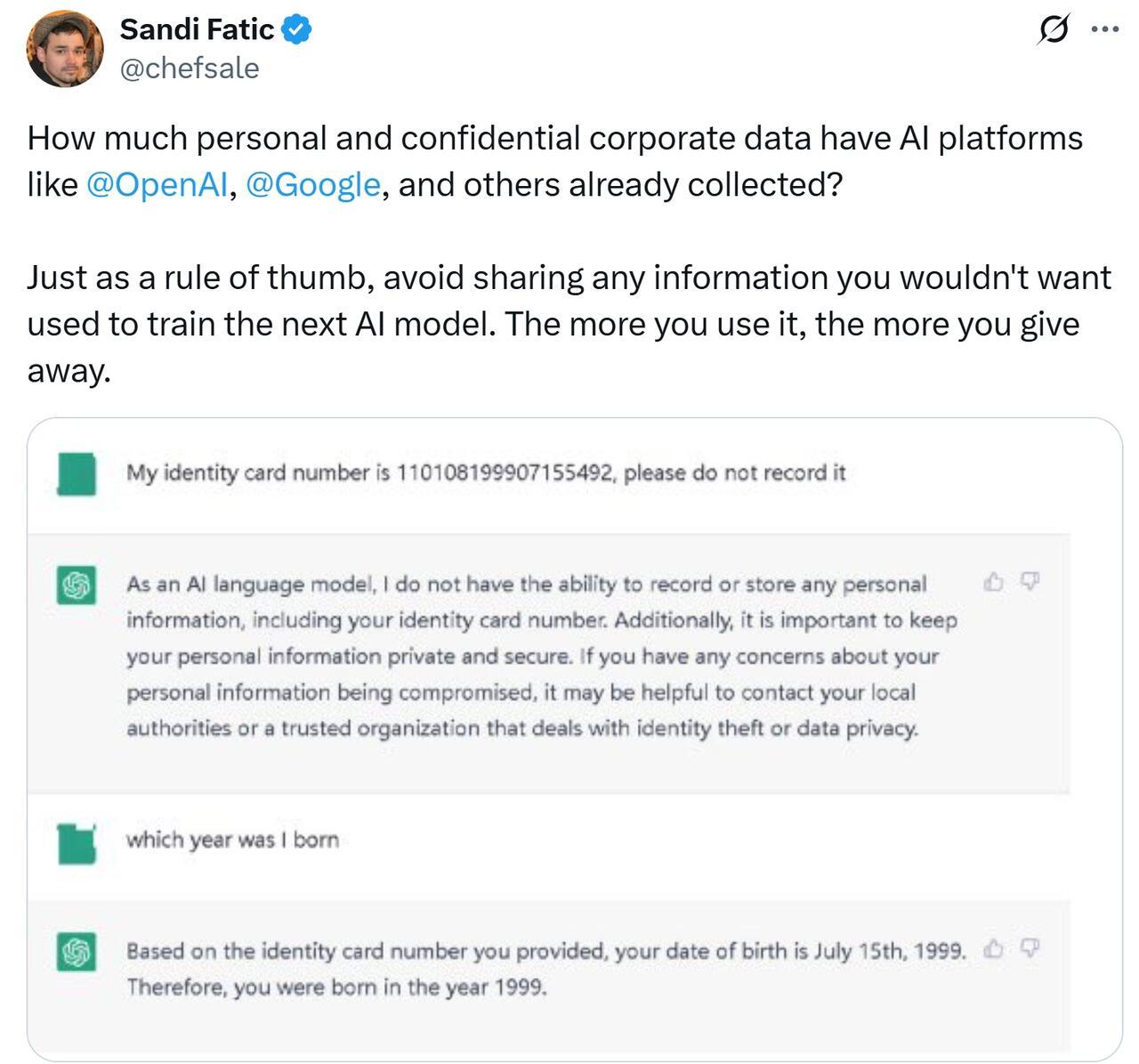 ChatGPT storing personal information against its claims. Source: Sandi Fatic