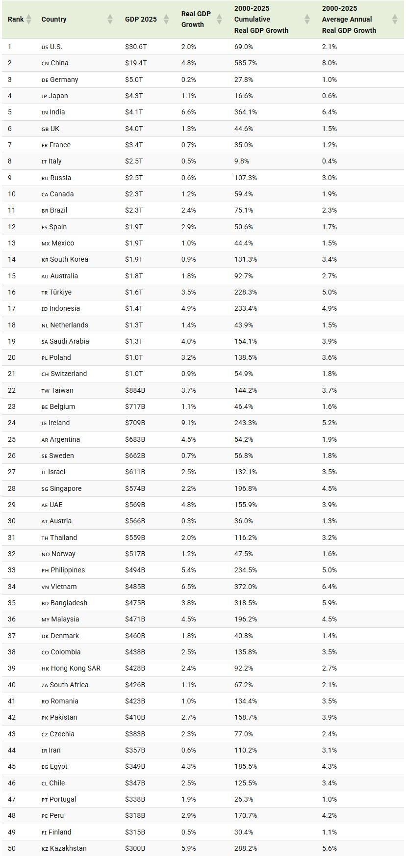 Below, we rank the 50 largest economies globally, highlighting their historical growth trends: