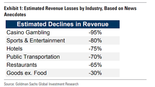 And Goldman Sachs' research appears to confirm this ugliness, as they compile anecdotes from recent press reports and company announcements to estimate the magnitudes of the increase in layoffs and decline in consumer spending due to the virus.