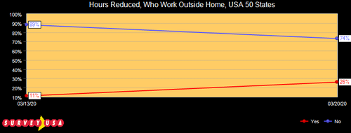 Early markers on the road from recession to depression as the Coronavirus threatens to stop the world from spinning on its axis show that 1 in 4 working Americans have had their hours reduced as a result of COVID-19, according to SurveyUSA's latest time-series tracking poll conducted 03/18/20 and 03/19/20.