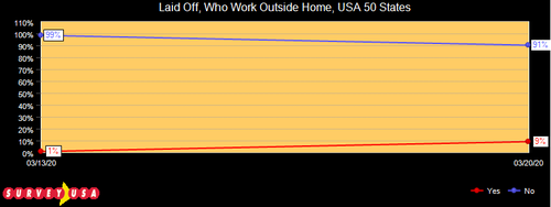 Methodology: SurveyUSA interviewed 1,000 USA adults nationwide 03/18/20 through 03/19/20. Of the adults, approximately 60% were, before the virus, employed full-time or part-time outside of the home and were asked the layoff and reduced-hours questions. Approximately half of the interviews for this survey were completed before the Big 3 Detroit automakers announced they were shutting down their Michigan assembly lines. For most Americans, events continue to unfold faster than a human mind is able to process the consequences.