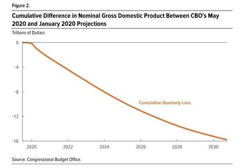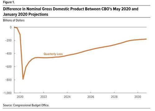 In its first official forecast incorporating the impact from the coronavirus shutdowns, today the Congressional Budget Office said that over the 2020–2030 period, cumulative GDP will be $15.7 trillion, or 5.3%, less in nominal dollars than what the agency projected in January. Putting that number in context, the nominal GDP of the US today is $21.5 trillion, in other words over the next decade, the Coronavirus will have wiped out almost one full year of output potential from the US economy.