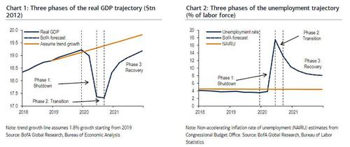 The permanent loss in output in the US economy was shown by BofA two weeks ago when the bank laid out the pre-covid trend growth and compared it to is base case recovery.