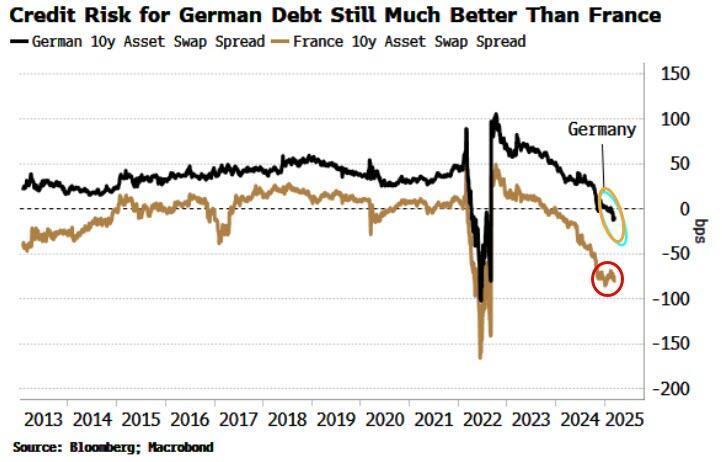 That’s in stark contrast to France, where the asset swap-spread has fallen by much more, suggesting considerable more reluctance for bond holders to own French debt given that country’s budget troubles.