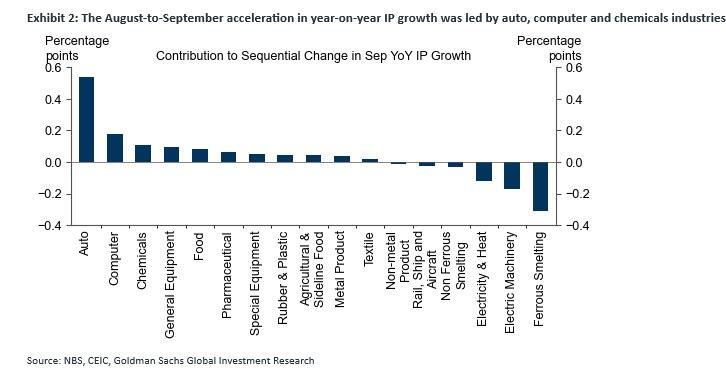 - 2. Industrial production (IP) growth rose to 6.5% yoy in September from 5.2% yoy in August thanks partly to the stronger-than-expected exports and an acceleration in auto output growth. On a sequential basis after seasonal adjustments, IP gained 1.4% mom non-annualized in September (vs. 0% mom non-annualized in August; Exhibit 1). By industry, the August-to-September acceleration in year-on-year IP growth was led by faster output growth in auto, computer and chemicals industries, more than offsetting slower output growth in the ferrous metal smelting industry (Exhibit 2). Among major industrial products (different from by-industry breakdown), auto output growth increased to +13.7% yoy in September from +10.5% yoy in August; computer and industrial robot output growth rose to -5.8% yoy and +28.3% yoy, respectively, in September from -13.1% yoy and +14.4% yoy in August. By comparison, year-on-year growth in power generation and cement output slowed to +1.5% and -8.6%, respectively, in September from +1.6% and -6.2% in August. Crude steel output growth dropped to -4.6% yoy in September from -0.7% yoy in August, and smartphone output growth also eased to +0.1% yoy from +3.2% yoy.