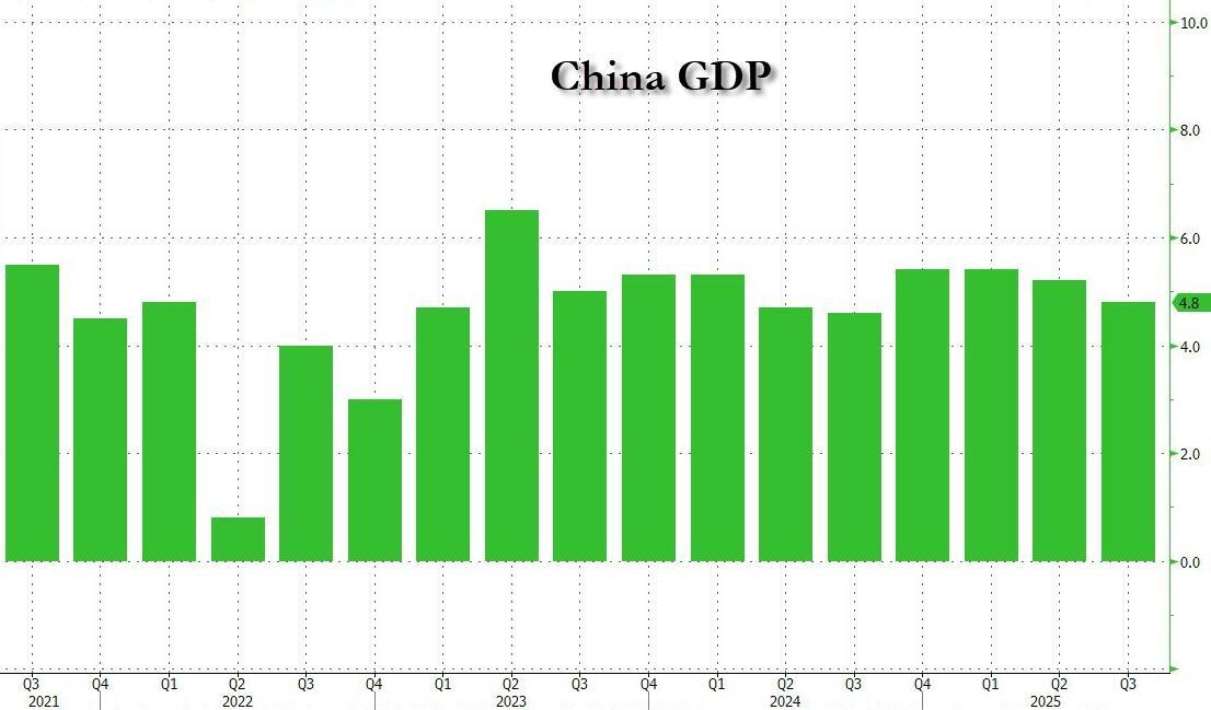 That's the optimistic view. A rather more realistic one comes from Reuters which writes that Beijing may be using the headline "resilience" in growth as a show of strength in talks between its vice premier He Lifeng and Treasury Secretary Scott Bessent in Malaysia in coming days and a potential meeting between presidents Donald Trump and Xi Jinping in South Korea later.