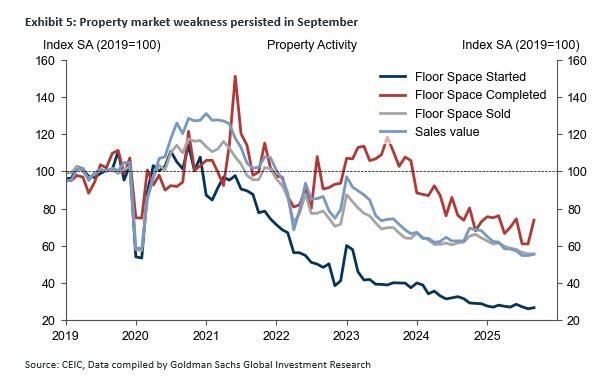 Slowing consumption is another drag on the economy. BBG estimates that retail sales growth fell below the pre-stimulus trend for the first time in September since the government ramped up stimulus in September 2024. In September, catering revenue rose only 0.9% year on year, the same as in June — the lowest growth rate since 2023. This reflected cautious consumption of households — as they spent less on unnecessary items. In addition, home appliance sales have slowed rapidly, indicating that the boost from government subsidies is fading. Sales in September increased 3.3% from a year earlier, far lower than that in August (14.3%) or July (28.7%).