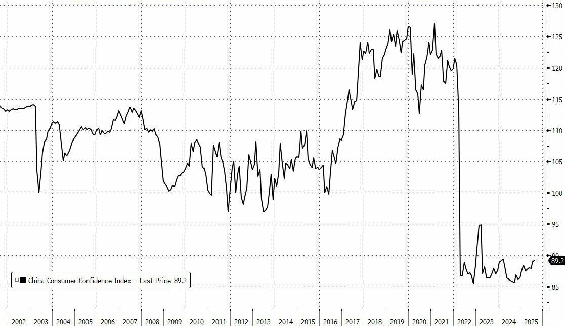 Sure enough, China's consumer confidence never managed to recovery after the covid crash, suggesting that behind the cheerful rhetoric, the mood on the ground in China is cataclysmic and that contrary to soundbites, should Trump continue to push and prod China in the ongoing trade war, he may well get what he wants.