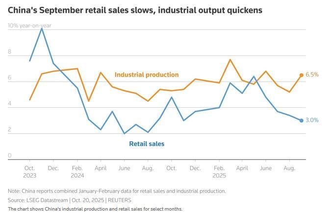 This intense competition among Chinese exporters feeds further weakness at home, with many having to cut wages and even jobs to stay in the race. As noted above, while industrial output grew to a three-month high of 6.5% year-on-year in September, beating forecasts, retail sales slowed to a 10-month low of 3.0%.