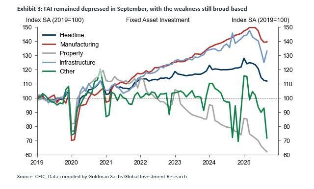 Looking ahead, Goldman writes that the divergent supply and demand trends underscore the need for the government to find effective ways to support growth, even if the economy does not require an additional boost in 4Q. The bank sees less monetary easing in 4Q, with only one possible cut in either the policy rate or the reserve requirement ratio, unlike earlier expectation of moves on both fronts. On the fiscal front, the focus will likely be on implementation and early groundwork for 2026, such as front-loading bond issuance and putting funds in place for projects. The sharp decline in government investment highlights the urgency of identifying more viable investment projects and social programs to spur consumption.