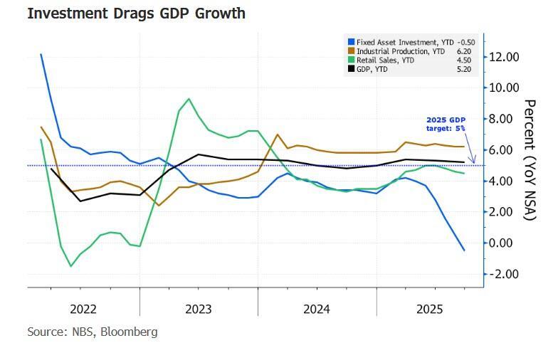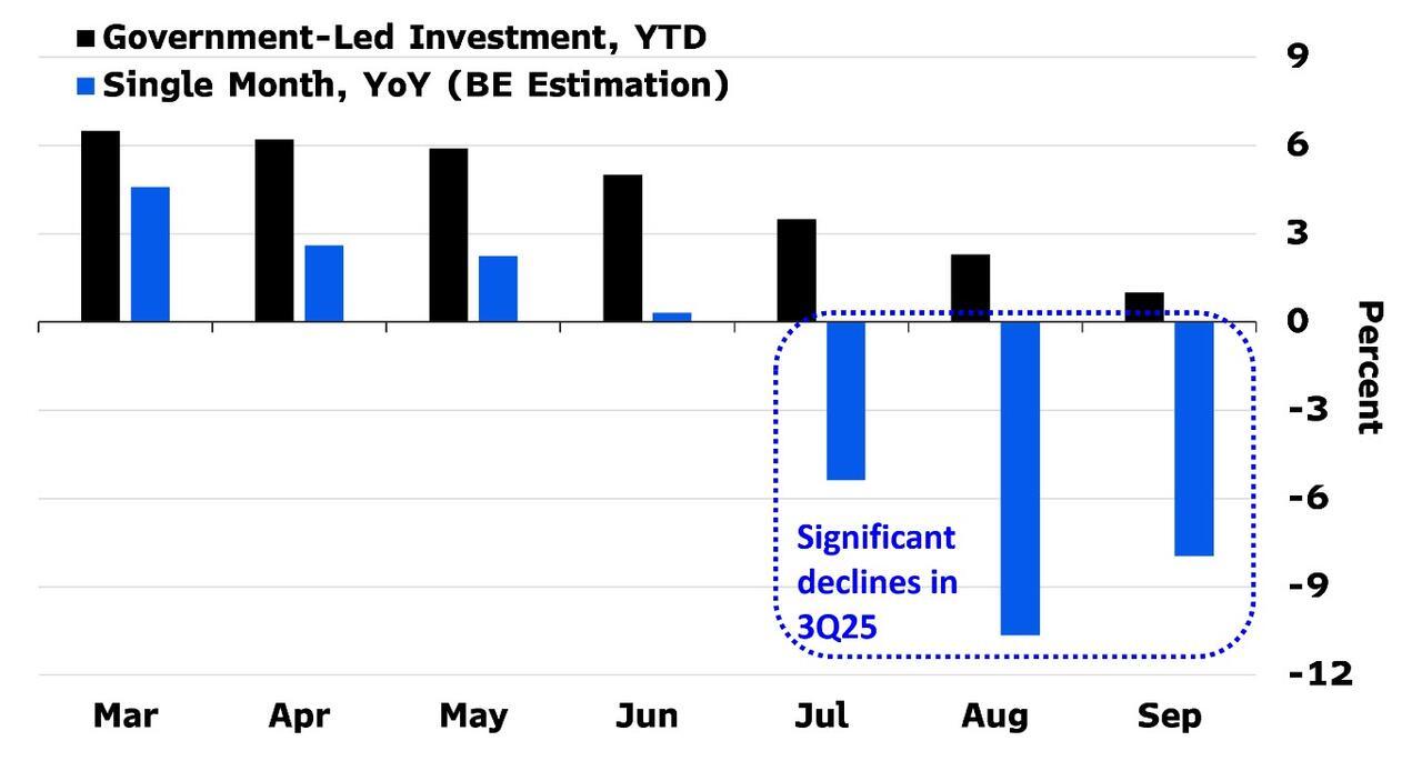 Yet the imbalance between supply and demand has aggravated. Consumption remains weak, and investment - including public investment - has emerged as the weakest link. That's because Bloomberg Economics calculates that fixed-asset investment contracted for the fourth month in a row, by as much as 7% in September.