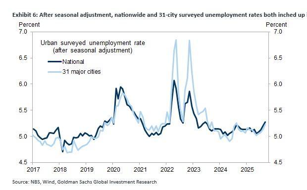 - 7. Regarding the labor market, the nationwide unemployment rate and the 31-city metric (not seasonally adjusted) both inched down to 5.2% in September from 5.3% in August. After seasonal adjustment, these two unemployment rate metrics continued to rise modestly in September. The unemployment rate for migrant workers (without local Hukou) was unchanged at 5.1% from August to September after seasonal adjustments. Following the NBS definition revisions (excluding students in schools) in January 2024, the release of youth unemployment rate data has been delayed by around three days vs. general labor market statistics. The latest data available suggests the unemployment rate of the 16-24 age group edged up to 18.9% in August from 17.8% in July, marginally above its recent peak of 18.8% in last August, given the 12.2 million college graduates this year (vs. 11.8 million in 2024). Goldman expects the youth unemployment rate to decline in coming months on seasonal factors, but caution it would be higher than year-ago levels due to weak domestic demand.