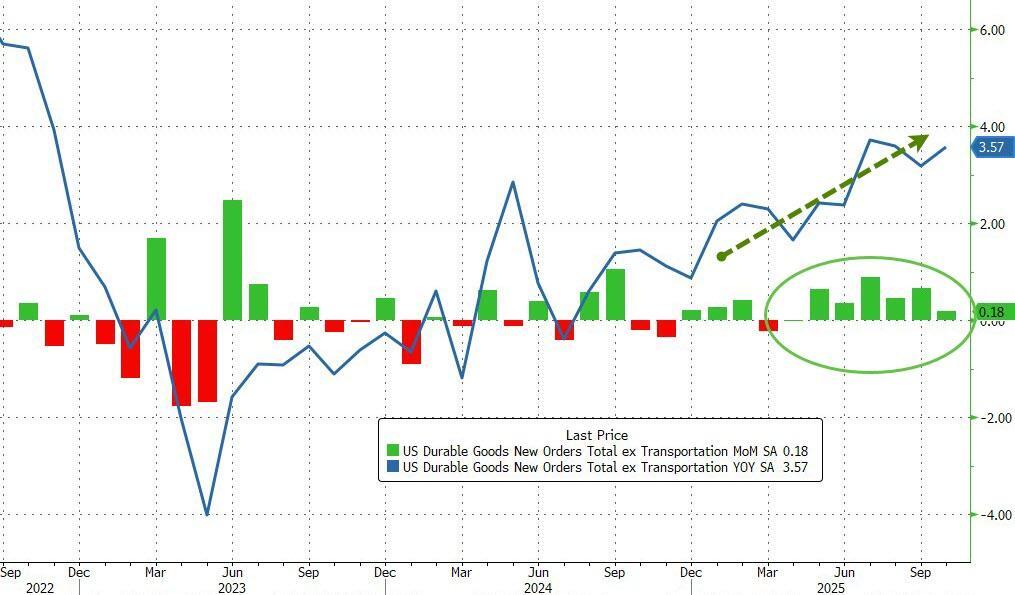Core Orders (ex Transports) rose 0.2% MoM (notably slower than the 0.7% MoM in September and below the +0.3% MoM expected)...