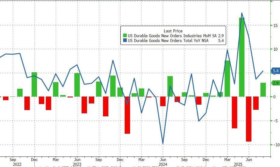 Amid all kinds of front-running and subsequent hangover swings in durable goods orders surrounding the tariffs, preliminary data for August shows a major rebound (+2.9% MoM), far better than the 0.3% MoM decline that analysts expected...