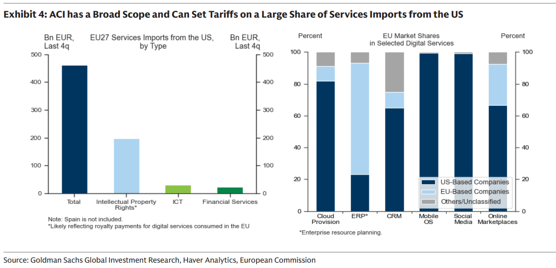 Specifically, the ACI could allow the EU to impose tariffs on services imports from the US. For reference, a flat 10% tariff on all EU imports of US services could mechanically raise about EUR 50bn in revenues.