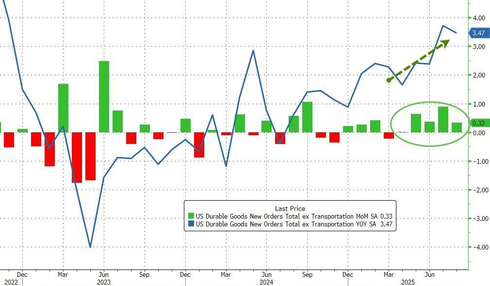 More broadly, durable goods orders (final for August) rose 2.9% MoM (up from -2.8% in July) while Core Durable Goods Orders (ex-transports) rose 0.3% MoM (slightly less than the 0.4% expected) but remained solid for the fifth month in a row...