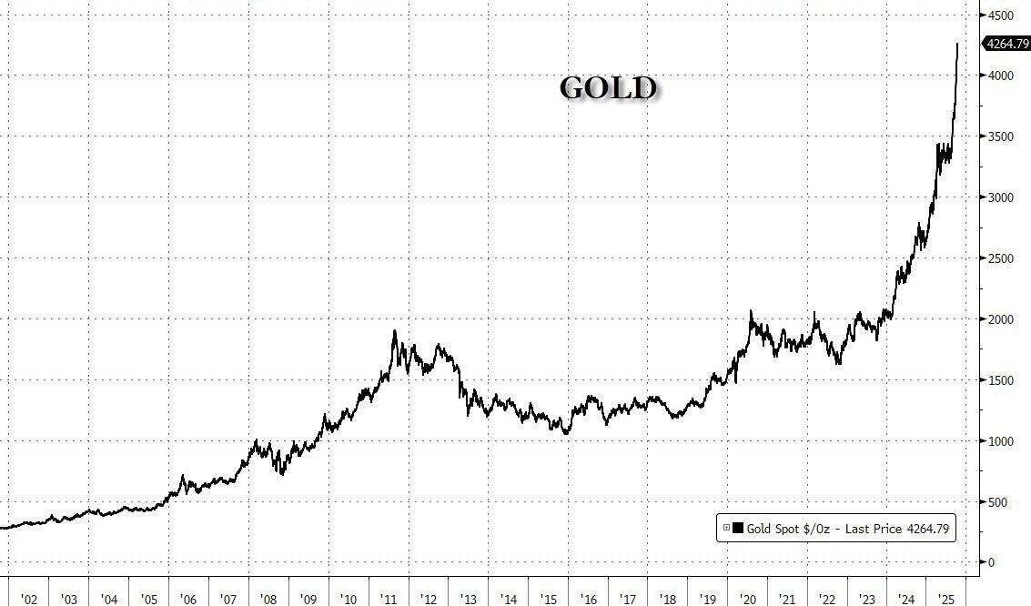 Equities may continually post gains, gold is too. The metal has surpassed $4,200 per troy ounce, in what has been coined the “debasement trade.” The IMF warned that global public debt will exceed 100% of GDP by the end of the decade, which would be the highest since the aftermath of World War II.