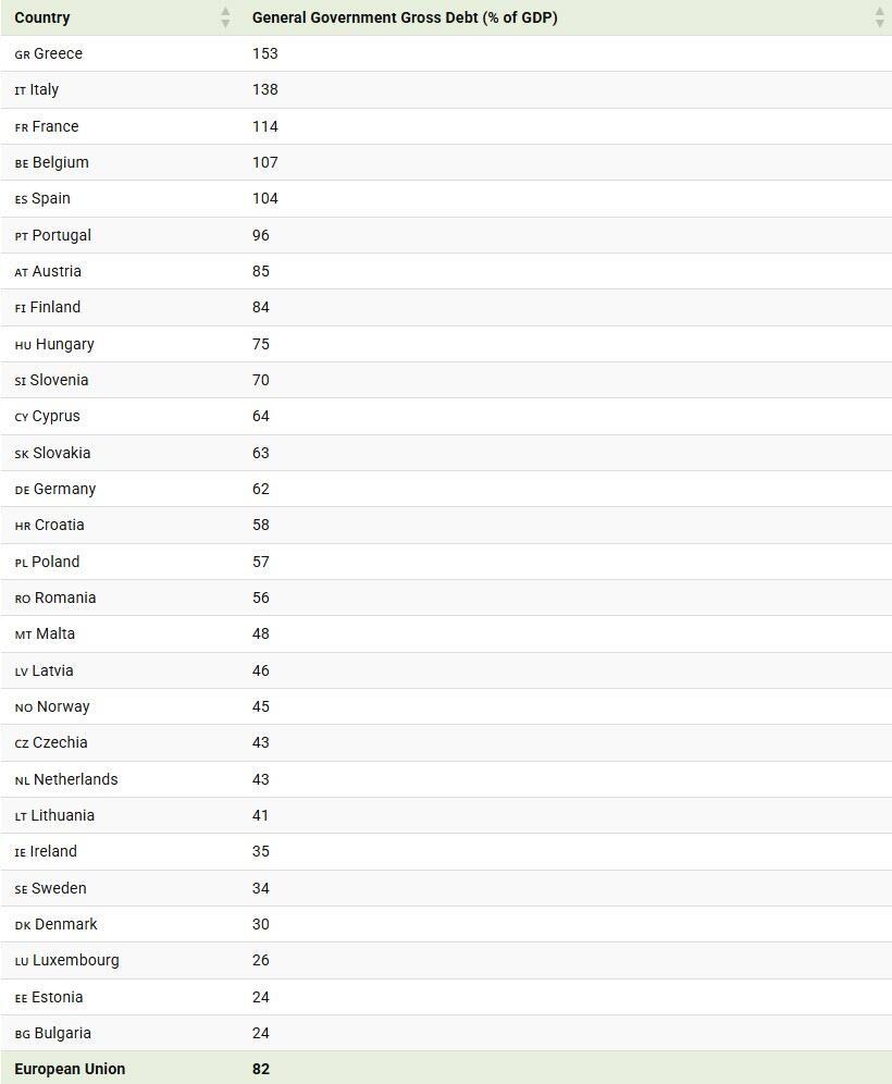 Below, we show general government gross debt as a percentage of GDP as of Q1 2025 in the EU: