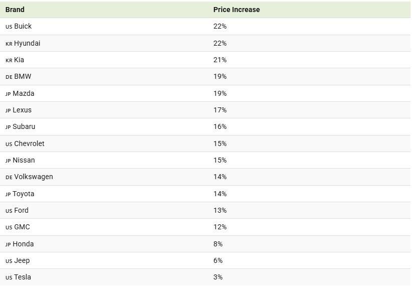 Although Buick is an American brand, the company produces many of its models in China and South Korea. As a result, Buick tops this list with a 22% projected price increase—the highest among all brands surveyed.