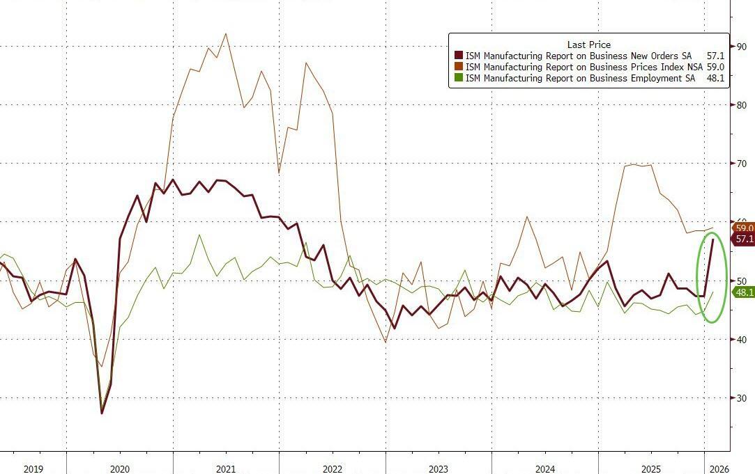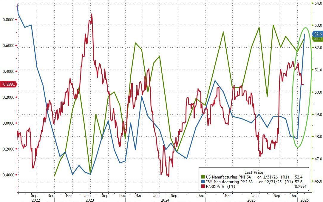 ISM's Manufacturing was expected to rise from 47.9 to 48.5 in January but instead it soared to 52.6 - its highest since Aug 2022. This is the first print above 50 since January 2025.