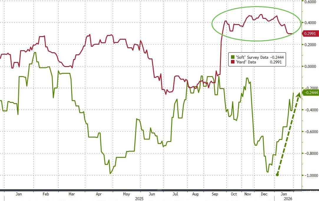 With 'hard' data sustaining signs of solid growth (e.g. factory orders and jobless claims), 'soft' survey data has been bouncing back since the start of the year