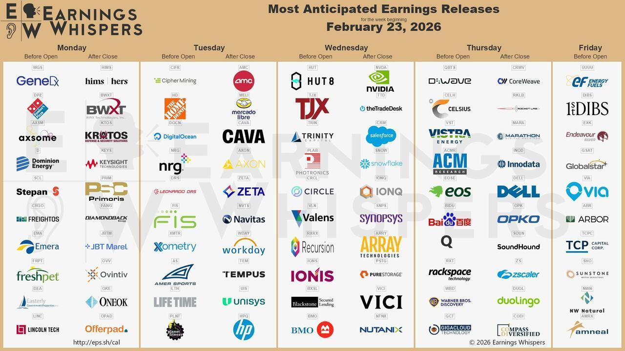 - Earnings: NVIDIA, HSBC, TJX, Salesforce, Lowe's, Iberdrola, Synopsys, Medline, Snowflake, E.ON, Diageo, Ferrovial, Haleon, Heidelberg Materials, Alcon, Leonardo, Trip.com, Sandoz, Wolters Kluwer, Paramount Skydance