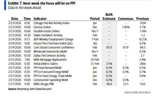 While much digital ink has been spilled on the Supreme Court's striking down of Trump's IEEPA tariffs and the consequences of this decision (see "Full Analysis Of The Supreme Court IEEPA Decision: How It Impacts The Economy, Policy And Markets"), a lot more is on deck for this week when we will also have more geopolitical headlines to contend with, as the latest round of US-Iran talks is expected in Geneva on Thursday. The talks come amid a recent buildup of US forces in the region and yesterday the New York Times was the latest outlet to report that Trump is considering an initial targeted strike against Iran in the coming days, which could be followed by a larger attack if Iran does not give in to US nuclear demands. Other highlights for the week ahead include the State of the Union address in the US (late tomorrow), US PPI and preliminary CPIs in Europe (both Friday). In earnings, the focus will be on Nvidia, Salesforce (both Wednesday) and Home Depot (tomorrow). Nvidia’s earnings could be the most important of these but expect lots of headlines from the State of the Union speech.