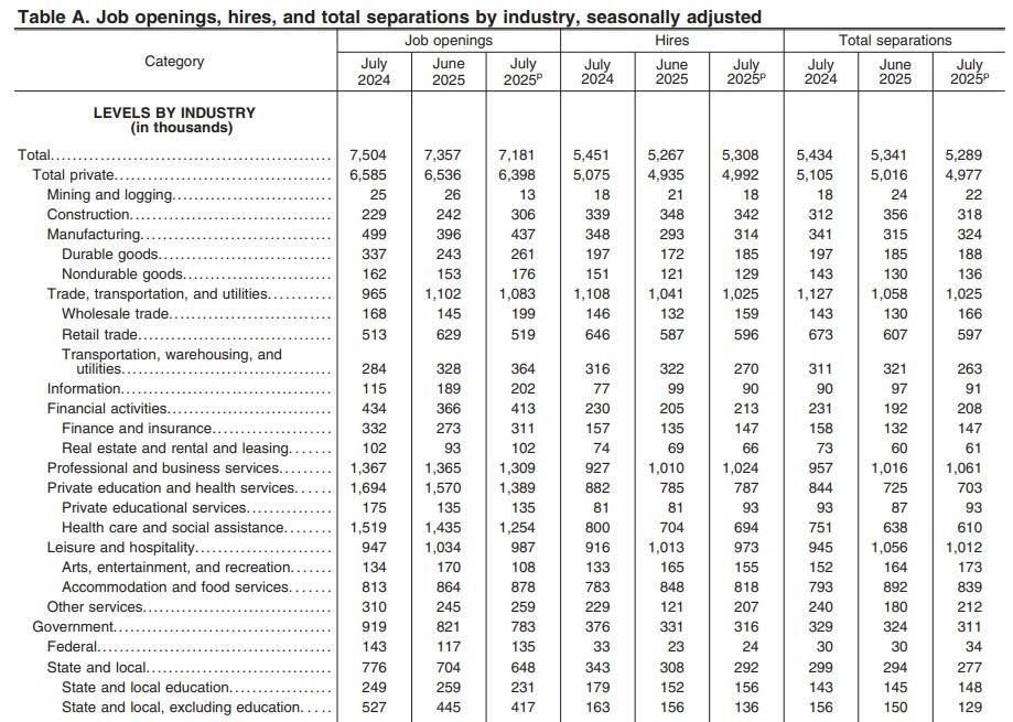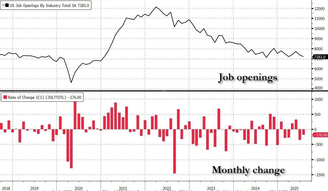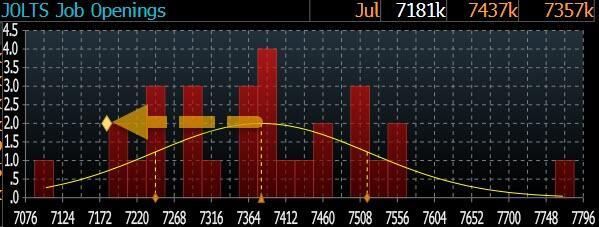 Well, moments ago the BLS reported that in July the number of job openings tumbled by another 176K from a downward revised 7.357MM(originally 7.437MM), to 7.181MM, which not only came in far below the median consensus estimate of 7.380MM and below 28 estimates from the 29 economists polled by Bloomberg...
