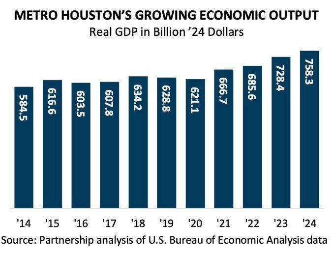Metro Houston's GDP hit $758.3 billion in 2024, crossing three-quarters of a trillion dollars in real, inflation-adjusted terms for the first time on record. That makes Houston the 6th largest metro economy in the United States, ahead of Washington D.C. and closing in fast on the cities above it.