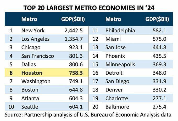 About that job growth: Houston real estate experts @Houstonomics just revealed that Houston became the 6th largest metro economy in 2024 (most recent data), and became the second fastest growing city out of the country's 20 largest metro economies.