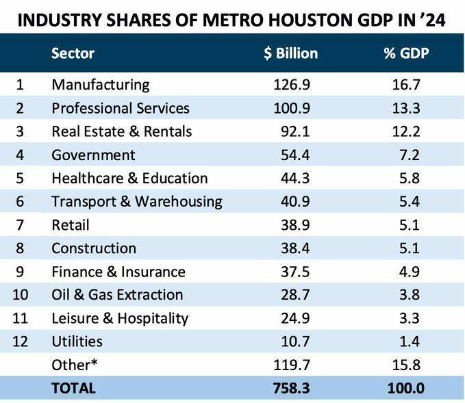 The conventional wisdom about Houston has always centered on energy. And yes, energy is still woven into the fabric of this city. But oil and gas extraction has fallen from 7.7% of GDP in 2014 to just 3.8% today, even as total output has grown. The city has not abandoned energy. It has grown everything else around it faster.