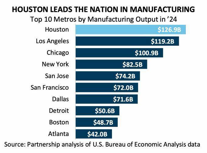 Manufacturing tells that story best. Houston produced $126.9 billion in manufactured goods in 2024, leading every metro in the country for the third straight year. More than Los Angeles. More than Chicago. More than double Detroit. Recent project announcements from Foxconn, Eli Lilly, and Tesla signal that this base is expanding well beyond its petrochemical roots.