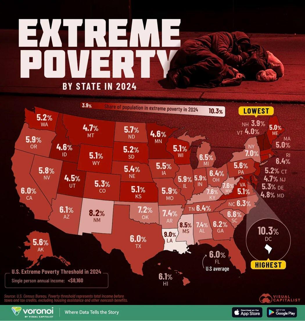 This graphic, viaVisual Capitalist's Dorothy Neufeld, shows the share of each state living in extreme poverty in 2024, based on data from the U.S. Census Bureau.