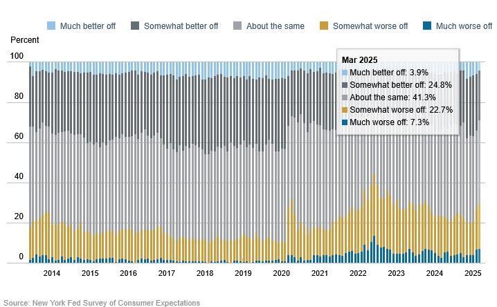 - Perceptions about households’ current financial situations compared to a year ago deteriorated slightly, with a larger share of households reporting a worse financial situation compared to a year ago. Year-ahead expectations about households’ financial situations also deteriorated in March. The share of households expecting a worse financial situation in one year from now rose to 30.0%, the highest level since October 2023.