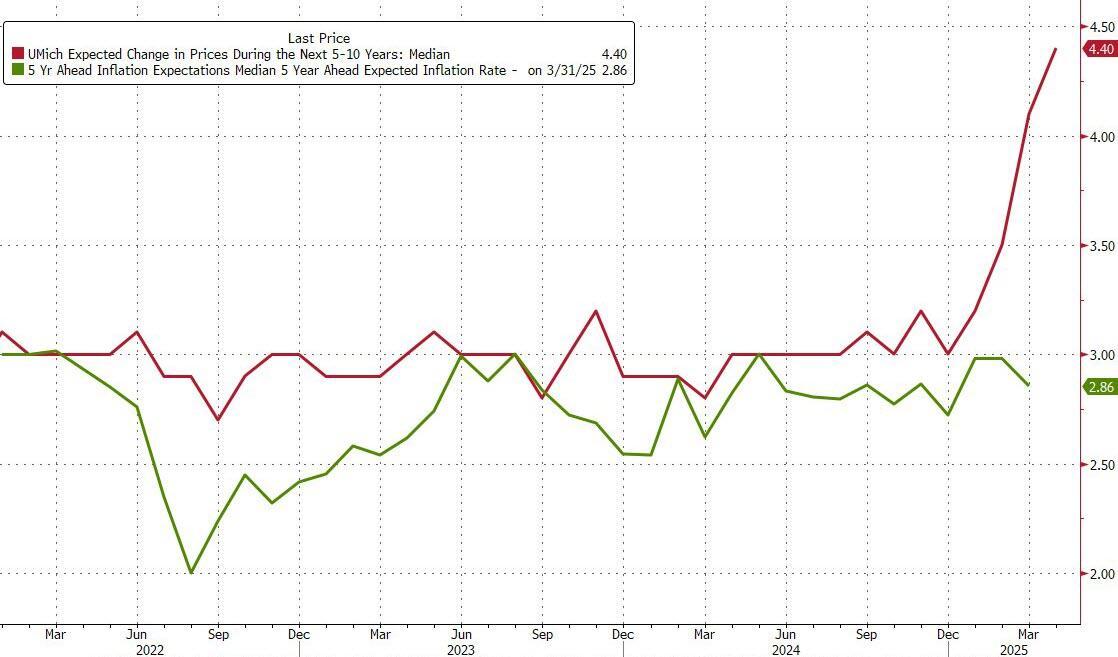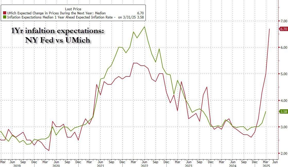 Not surprisingly, two-year yields promptly fell to session lows after the inflation data hit the tape, because the NY Fed survey now openly contradicts UMich as one-year inflation expectations - which rose to 3.6% in March, the highest since September 2023 - remained far, far lower than the Democrat-skewed 6.7% preliminary print for the April UMich report.