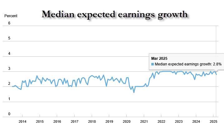 - Median one-year-ahead earnings growth expectations fell by 0.2 percentage point to 2.8% in March, equaling its 12-month trailing average. Needless to say, it's tough to have rising inflation when earnings are collapsing, but good luck explaining that to Democrats.