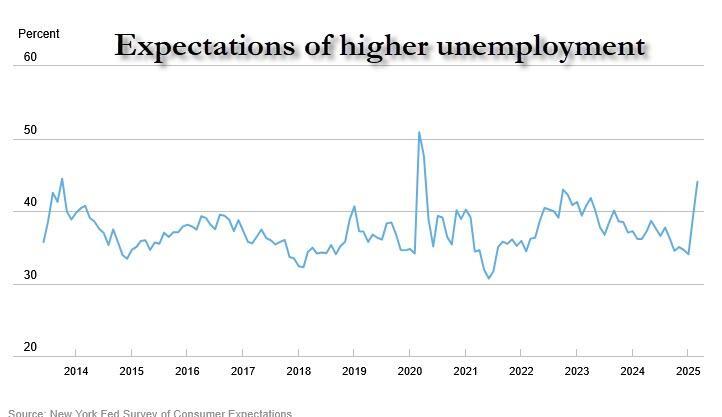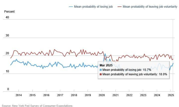 - There's more: the perceived probability of losing one’s job in the next 12 months increased by 1.6 percentage points to 15.7%, the highest level since March 2024. The increase was largest for respondents with annual household incomes below $50,000. The mean probability of leaving one’s job voluntarily in the next 12 months increased by 0.4 percentage point to 18.0%, remaining far below the 12-month trailing average of 19.7%.