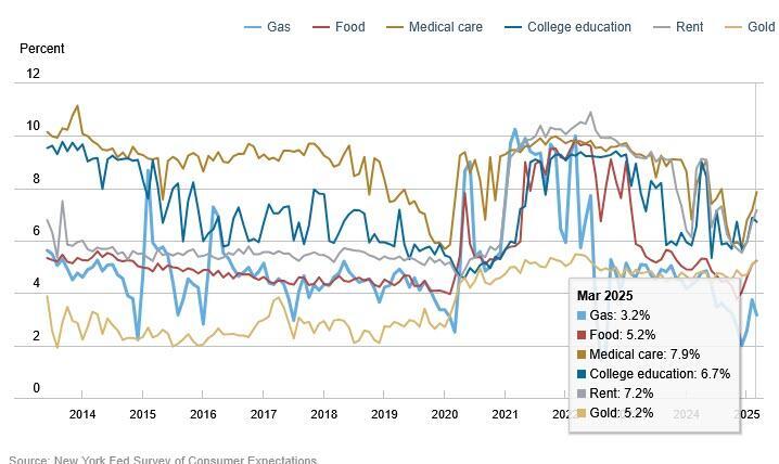 - Median year-ahead expected price growth increased by 0.1 percentage point for food to 5.2% (its highest level since May 2024), 0.7 percentage point for the cost of medical care to 7.9%, and 0.5 percentage point for rent to 7.2%. Median year-ahead price expectations fell by 0.5 percentage point for gas to 3.2% and 0.2 percentage point for the cost of college education to 6.7%.