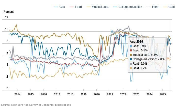 Turning to household finance expectations, the median expected growth in household income remained unchanged for the second consecutive month at 2.9% in August, equaling its 12-month trailing average. Median household spending growth expectations increased by 0.1 percentage point to 5.0%. The series has been moving in a range between 4.8% and 5.2% since February 2025.