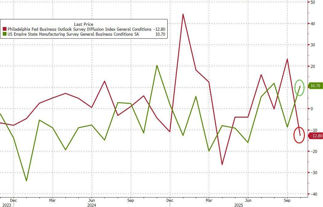After yesterday's surge in the New York Fed's Manufacturing survey (showing strong new orders and employment), this morning we get their neighbor - the Philly Fed's - manufacturing survey data... and it's, umm, quite different...