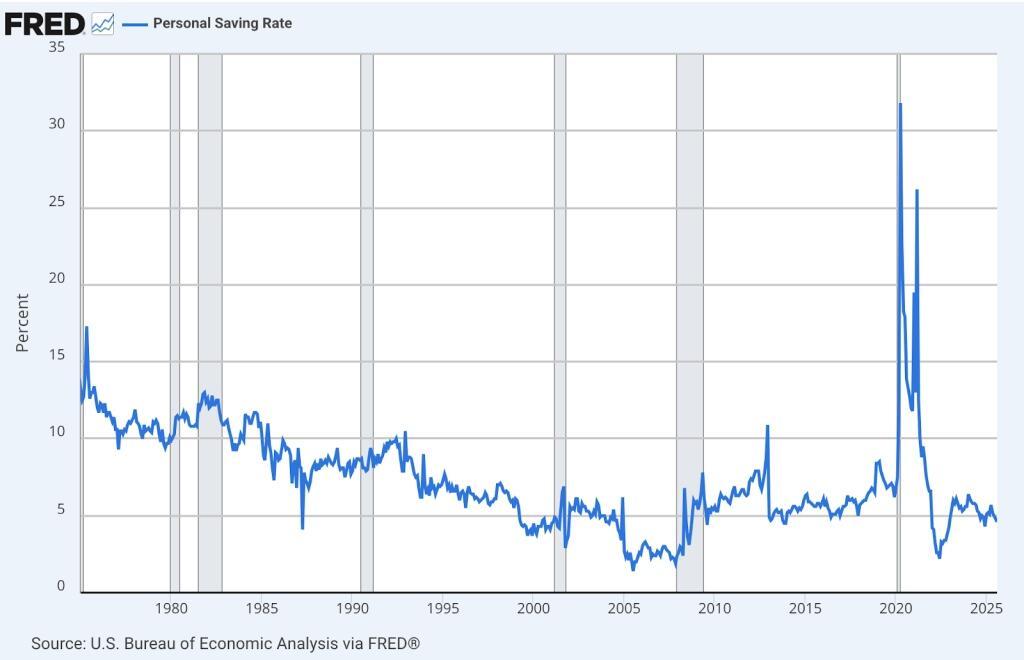It should now be clear that economists and politicians trumpeting growth are being misled or misleading themselves into promoting inflationary policies. The only offset is savings. If consumers save instead of spending, then consumer prices will not be driven up so much by excess credit. But here the US’s record over time is dismal:
