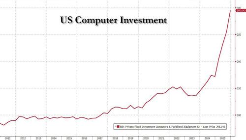 Government slowdown aside, perhaps an even more notable print is the continued explosion in spending on computers/peripheral equipment courtesy of AI, which has surged 70% in the past year and has more than doubled to $300BN at the end of 2025, more than double since the launch of chatGPT in 2022.